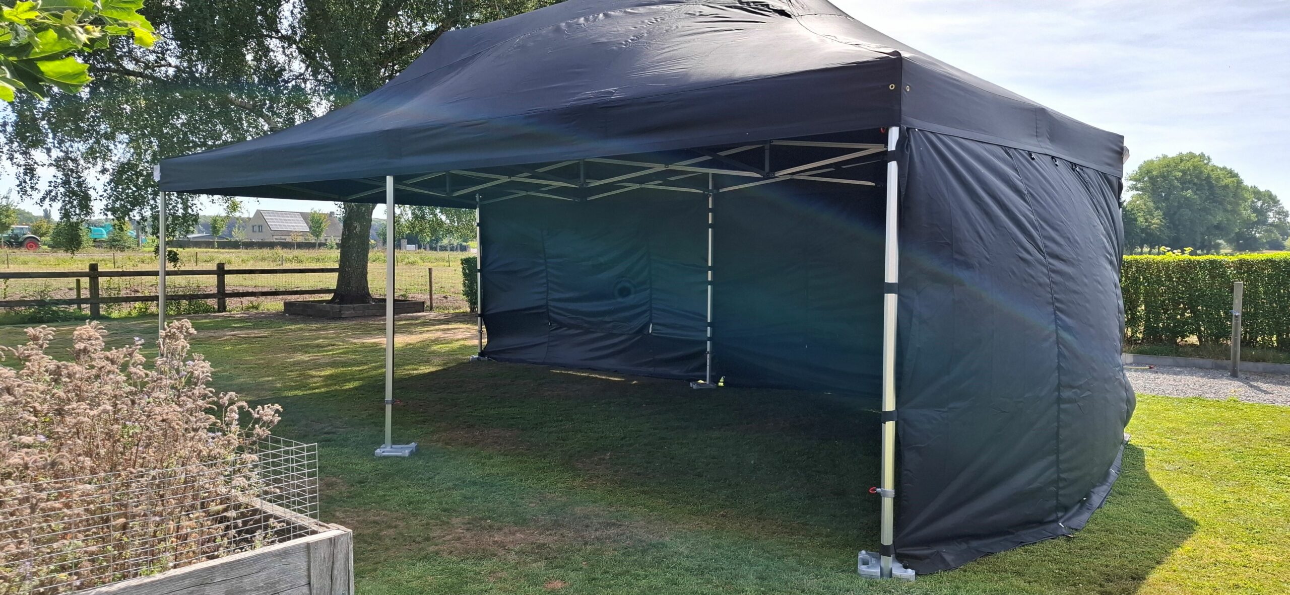 Professionele tent voor al uw feestjes. Volledig afsluitbaar. Afmetingen: 8 x 4 meter (plaats voor ongeveer 35 mensen). Tent wordt geplaatst en terug opgehaald. Vooraf te bepalen aantal zijkanten. Ter plaatse dienen minstens 3 helpers beschikbaar te zijn.